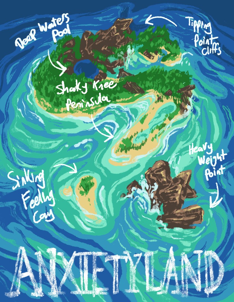 For my next map, I wanted to create something that didn’t refer to a real place, but instead explored mapping a fictional place: Anxietyland! This was an exploration into themes of the body, mental health, design, and illustration, and I had a lot of fun doing it! I learned a lot about hand drawn type and the crossroads of design and illustration.
