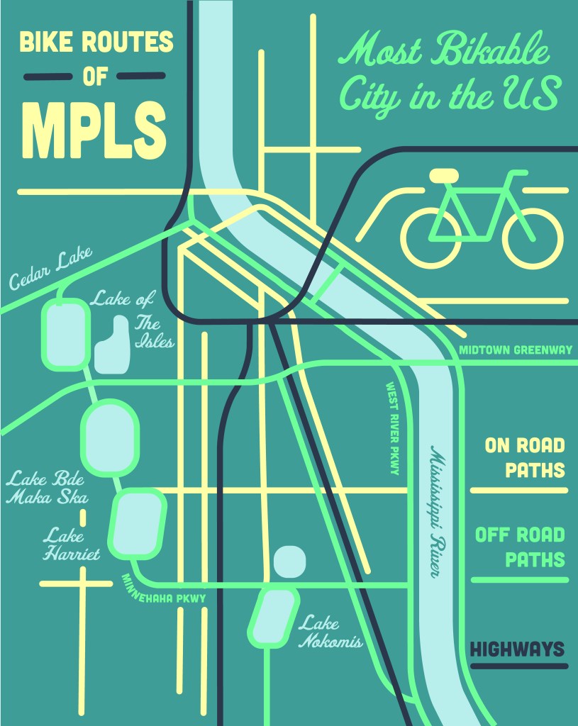 I wanted to try creating a map of a real place that works as both a map but also a poster, so in this piece I had to balance aesthetics and function as I worked, while also considering aspects like typography, composition, and readability. I am very happy with how my map of Minneapolis turned out, and I would love to create more of these posters in the future now that I understand how to do it!